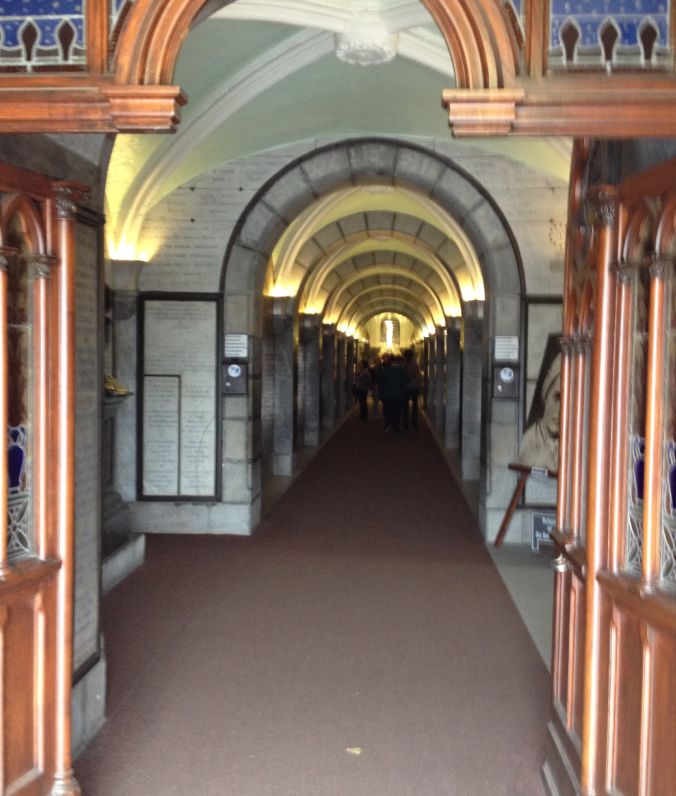A long access corridor covered with ex-votos (thanking and praising God, through
