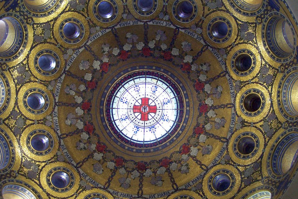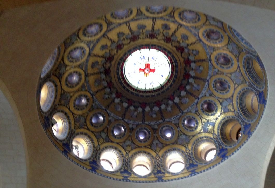 The dome contains sixteen circular stained glass windows. The fifteen spaces between these windows signify the fifteen decades of the traditional rosary.