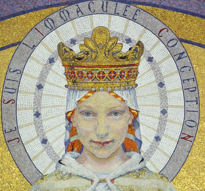 Close up view of the beautiful Mosaic depicting the Virgin Mary. Here the Virgin Mary is represented as a very young woman just as Bernadette's descriptions of the apparition. |