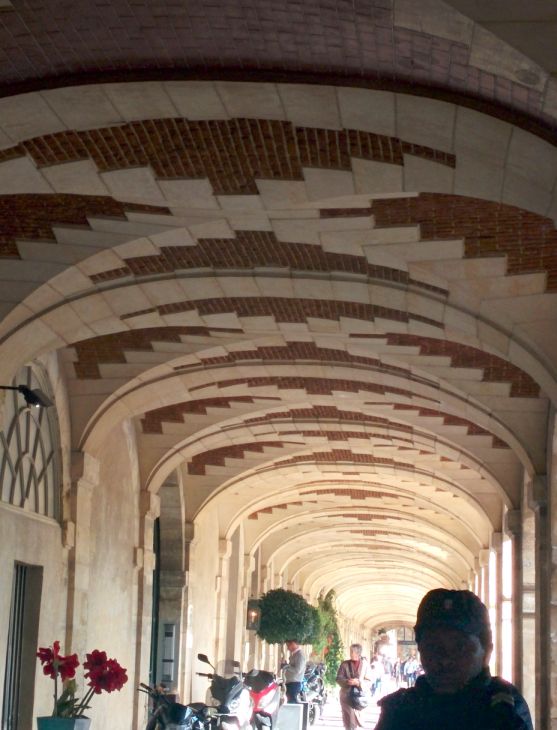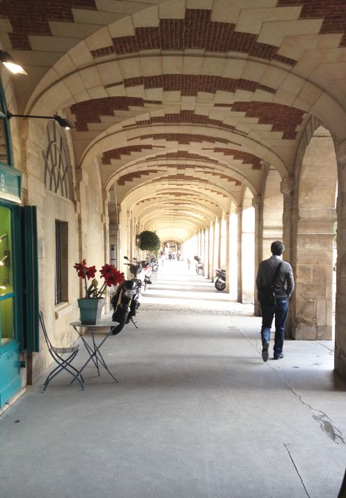 Walking under the covered galleries leading out from the Hôtel de Sully.