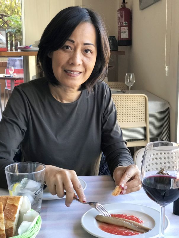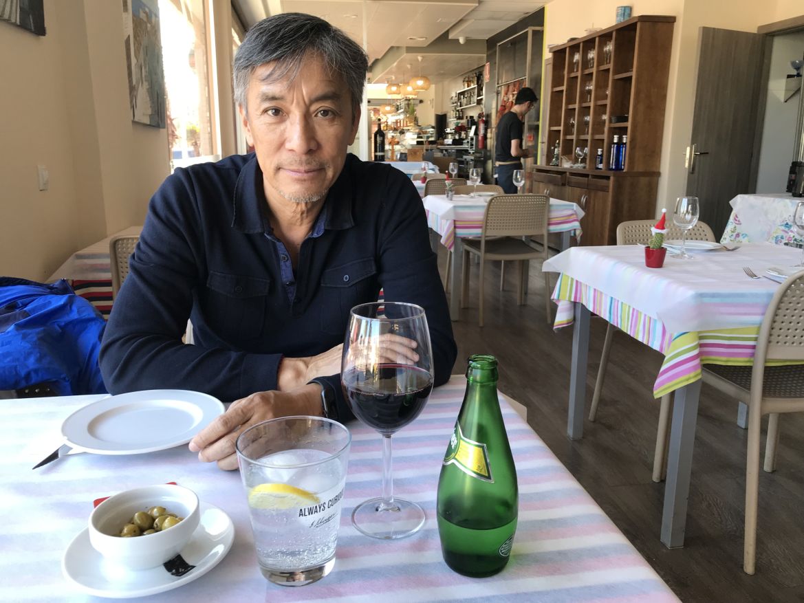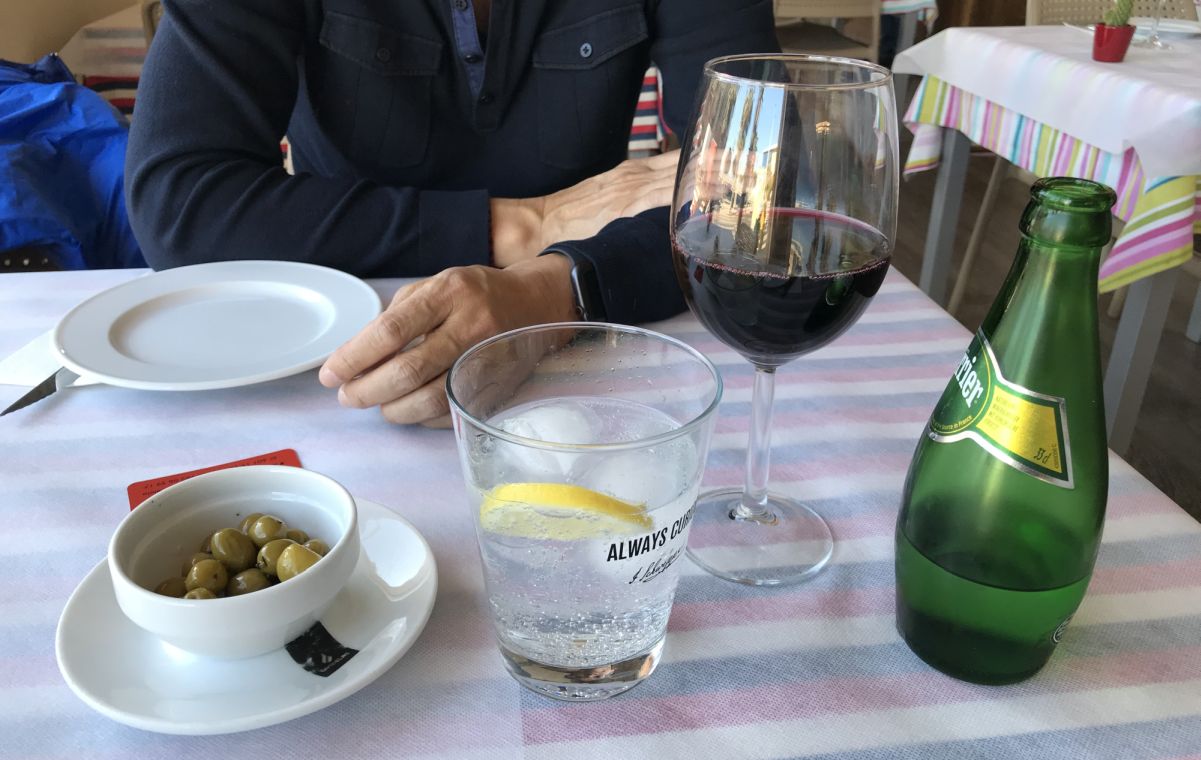 Sparkling water for me, Wine for Hoa, and a bowl of marinated olive to wet our appetite.