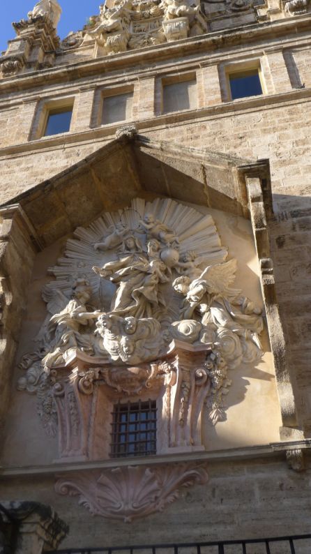 The main facade, looking out on the Plaza del Mercado and facing the Lonja, and has become a meeting point, it was given special attention creating a reredos in which the central figure of the Virgen del Rosario stands out.