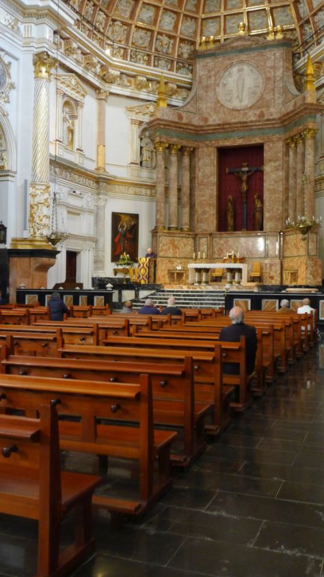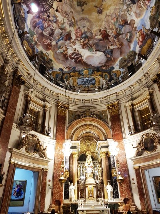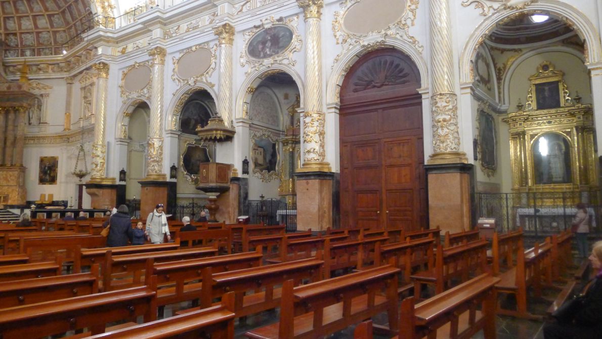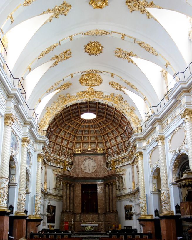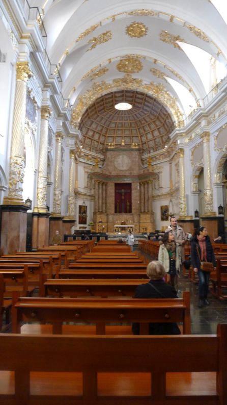 White and gold dominate the interior with bright golden designs to ornate the ceilings. The paintings, sculptures and walls have all been renovated or restored and the way the church was originally built.