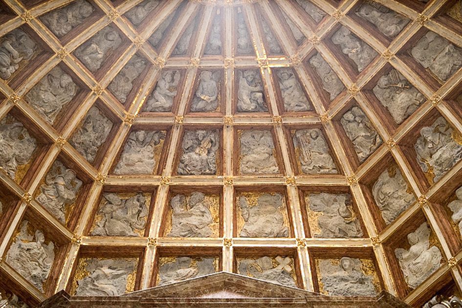 The most striking feature in this church is the dome above the altar whose curved grid features 164 distinctive carvings.