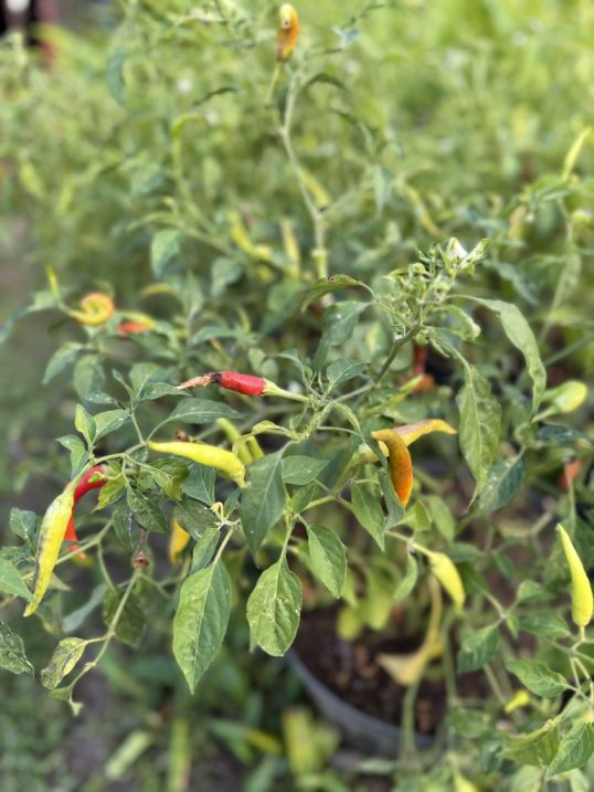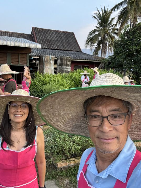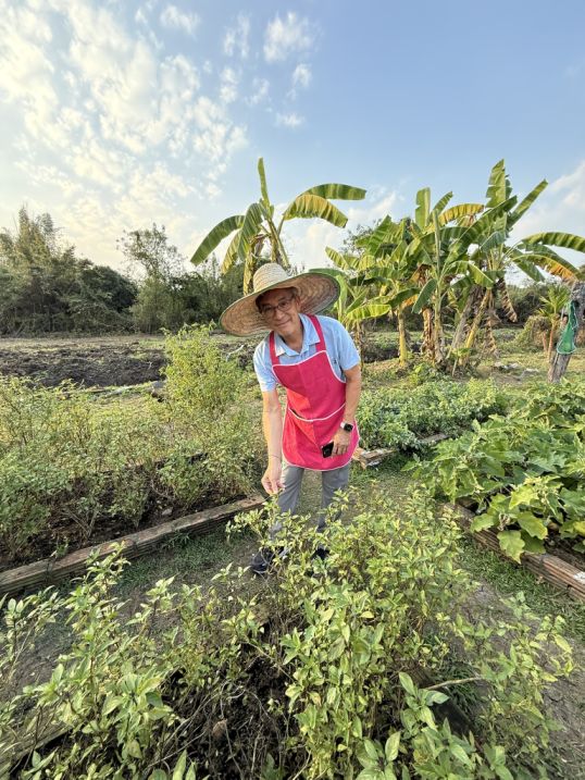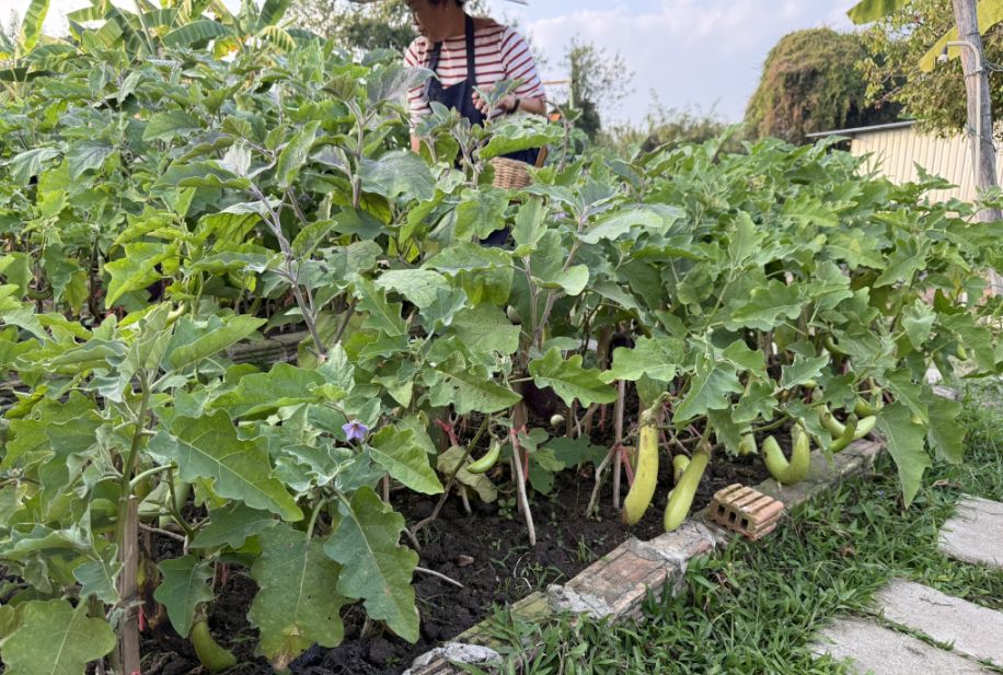 There were also chili plants. One plant that caught our attention looked like a small lemon tree, but we learned that the fruit is not typically eaten. Instead, the highly aromatic leaves are widely used in Thai cooking. This plant is known as Kaffir Lime (also called makrut lime), and its fragrant leaves are an essential ingredient that adds a distinctive citrusy aroma to many Thai soups, curries, and stir-fries.