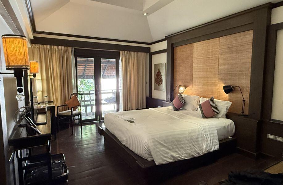 Our room was spacious and calm, decorated with warm wood tones, soft lighting, and Thai-inspired details that gave it an elegant yet relaxed atmosphere.