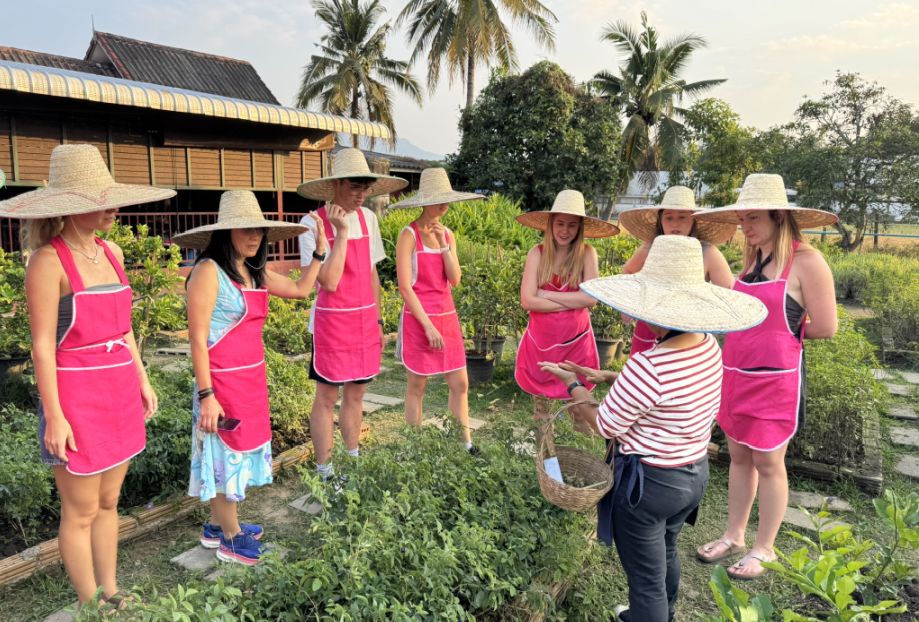 We all put a pink apron, a straw hat, and we are headed to the organic garden, located just behind the cooking school area.