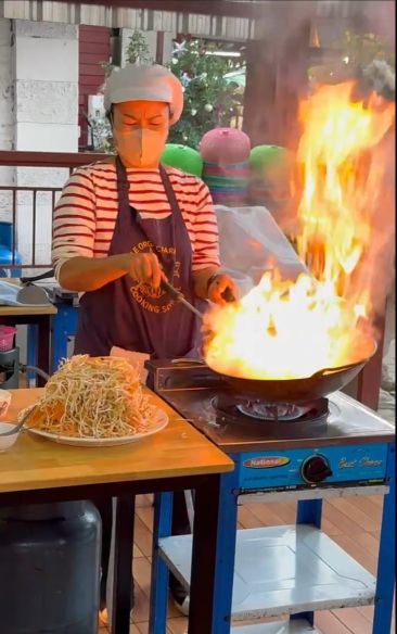 Our instructor demonstrating how to prepare vegetarian egg rolls. It is really cool to see how she use the pan and lit it up by making contact with the burning flames.