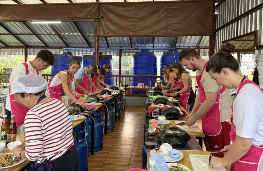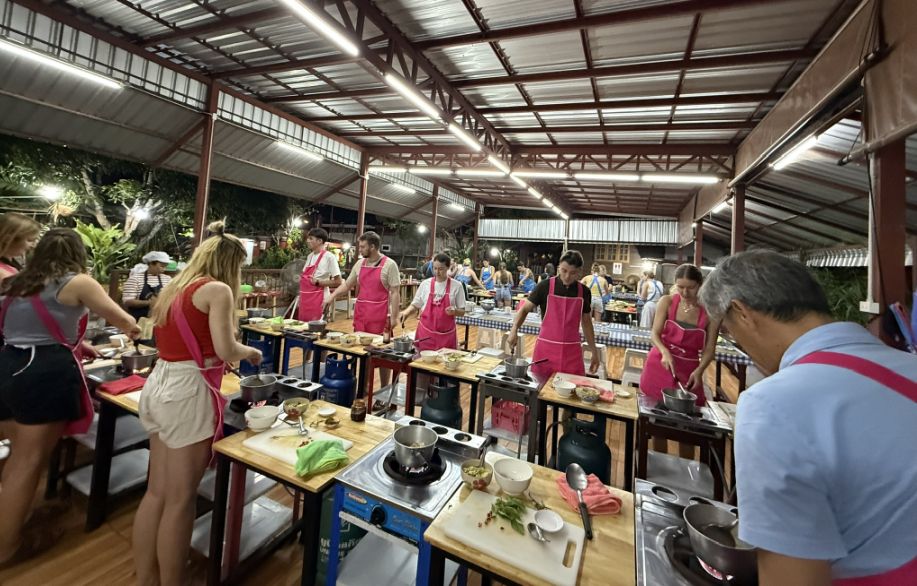 Our group consisted of 12 people, and just behind us there was another group of 12 beginning their class as well. The cooking area alone looked large enough to accommodate at least three groups of that size simultaneously, suggesting the school can easily host 60 to 80 participants in a day. Despite the scale, the space still felt organized and relaxed, with plenty of room for everyone to cook comfortably.