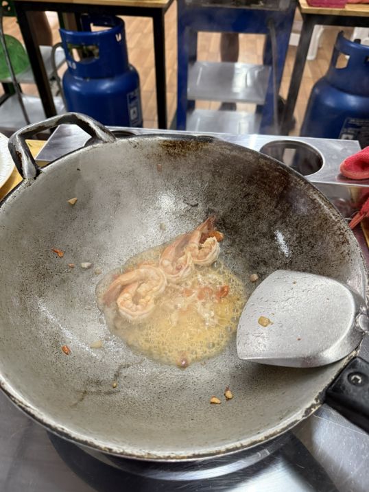 Once the shrimps are cooked, vegetables, noodles, eggs are added.