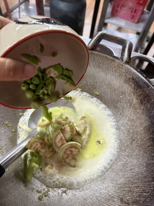 Next, we are making a green curry with chicken. Hoa cutting the green beans, and Thai eggplant.