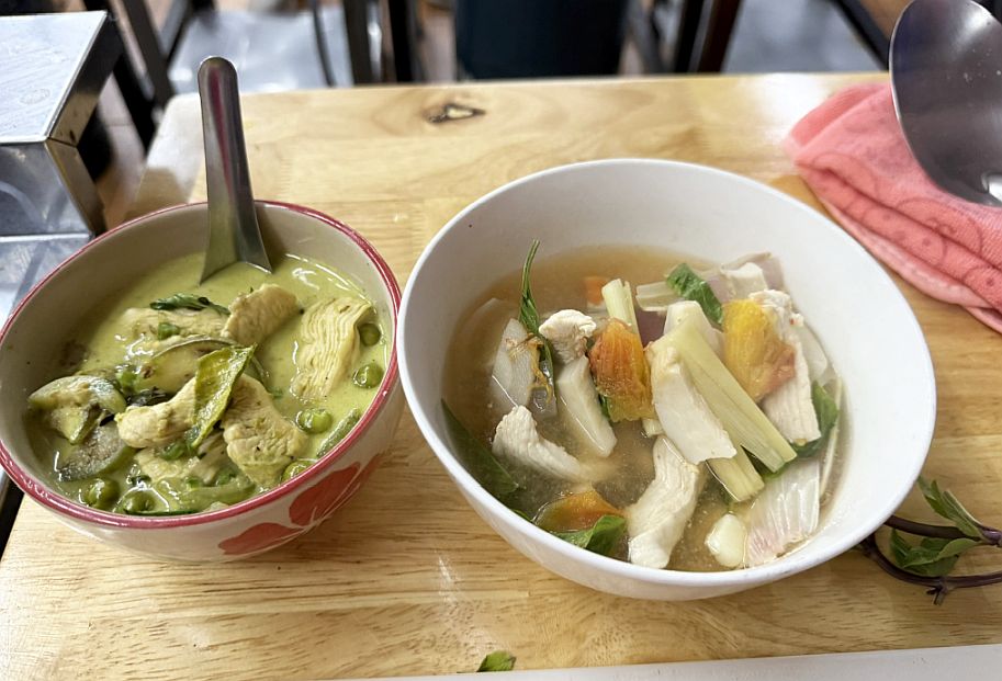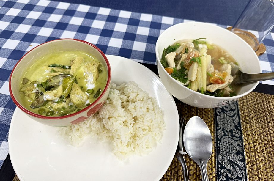 Here are the two dishes we made: Green curry with chicken, and Thai chicken soup.