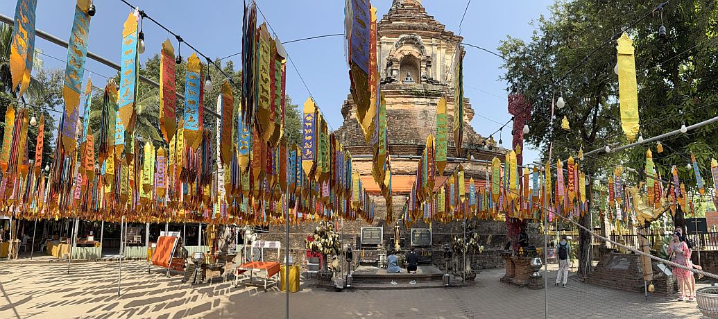 Below the chedi are colorful flags hanging across the courtyard.