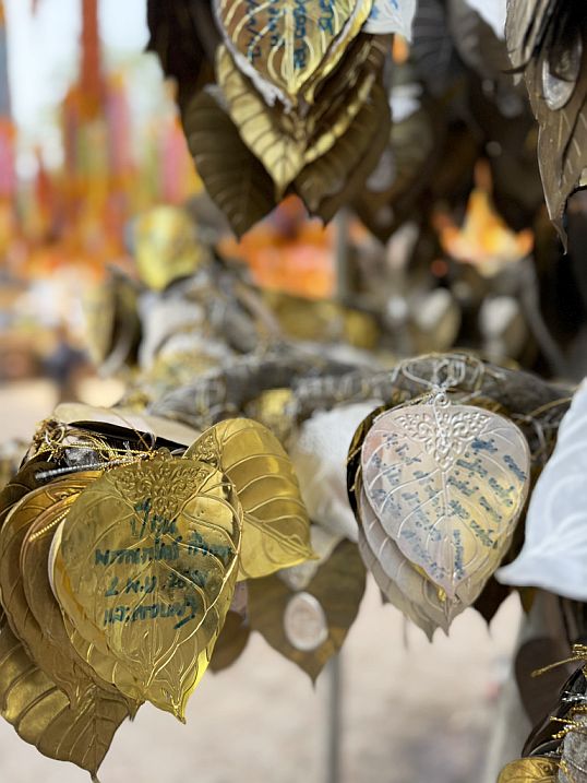 Nearby we also saw a metal “tree” with golden leaves. This is a merit tree. Visitors write their names or short prayers on the thin golden leaves and hang them on the branches. The act symbolizes making merit and offering support to the temple. The inscriptions are usually names, wishes for good fortune, or prayers for family members.