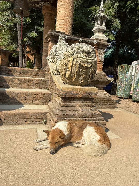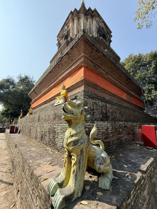 As we walked around the chedi, lion-or dog-like statues placed at the corners of the lower levels. These figures are known as guardian lions (often called Singha in northern Thai tradition). They are protective creatures placed around sacred structures to guard the temple and ward off negative spirits.