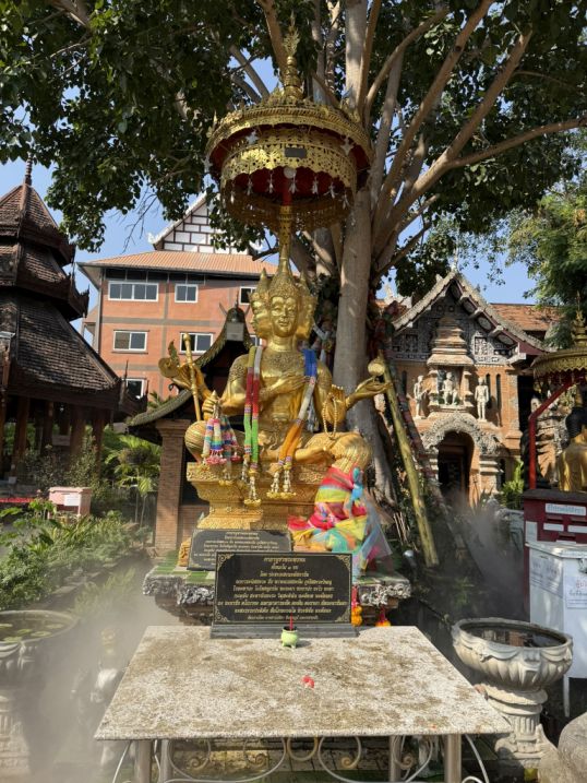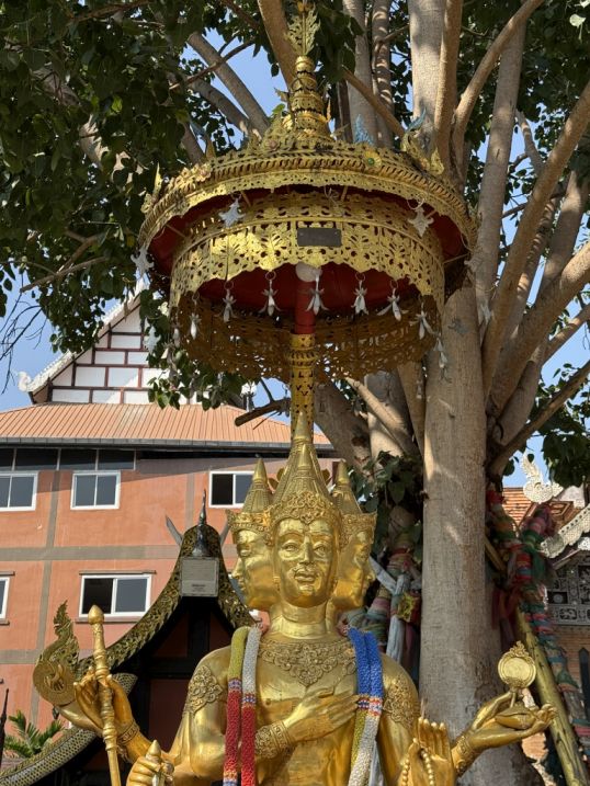 The golden Buddha with four faces sitting beneath a golden parasol is a striking figure. In Thai Buddhist symbolism, a multi-faced Buddha or deity represents the ability to see in all directions, symbolizing wisdom and awareness that extends everywhere.