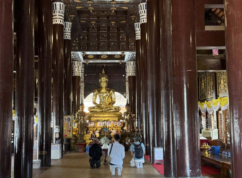 Inside the hall sits the main Buddha statue, where monks and local worshippers come to pray and meditate. The interior space is calm and dimly lit, creating a peaceful atmosphere that contrasts with the bright open courtyard outside. The hall itself, with its high wooden ceiling and dim interior, creates a peaceful atmosphere that encourages reflection.
