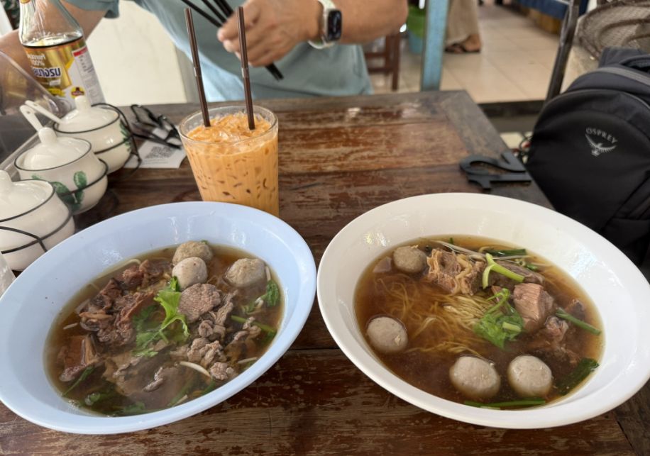 The restaurant specializes in Thai-style beef noodle soup, where tender slices of beef and noodles are served in a rich, aromatic broth that has been slowly simmered with herbs and spices. The bowls are simple but incredibly satisfying, and one of the best things about places like this is the price. Even a full bowl of noodle soup costs very little, making it an everyday meal for many locals. Small neighborhood noodle shops like this are a cornerstone of Thai food culture, quick, flavorful, and affordable.