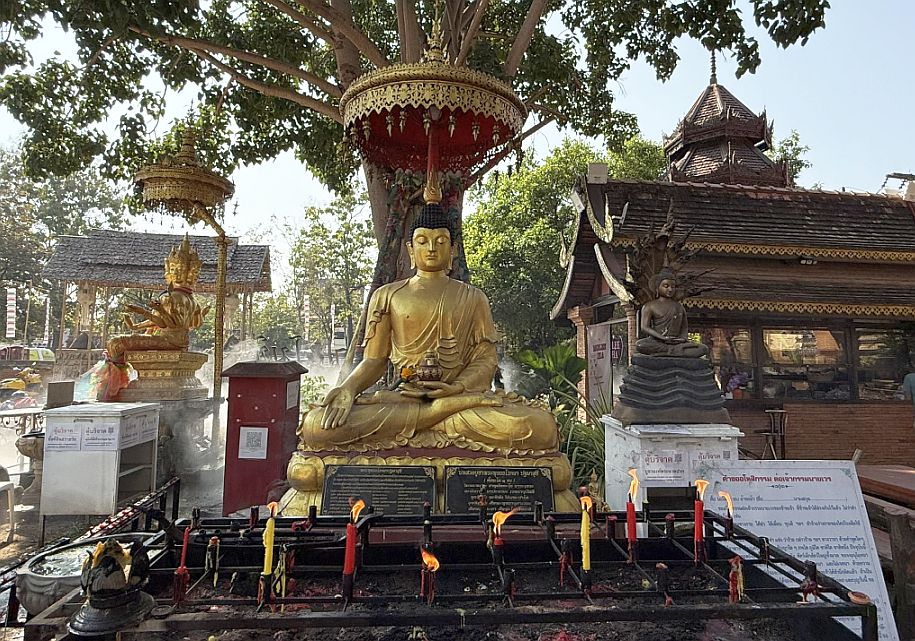 The large golden Buddha is the principal image of the temple. The statue is seated in the meditation posture, with a calm and serene expression typical of northern Thai (Lanna) Buddha images. These statues are meant to represent the Buddha at the moment of deep meditation leading to enlightenment. The gold surface reflects light from candles and offerings, symbolizing purity, wisdom, and spiritual illumination. Locals often come here to sit quietly in front of the statue, make offerings of incense, flowers, or candles, and spend a few moments in prayer or meditation.