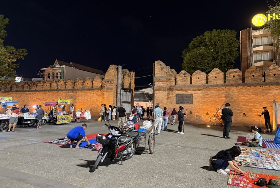 Later in the evening, we walked toward Chang Phuak Gate, the North Gate of the old city. At night the area becomes very lively. Vendors line the sidewalks and nearby streets, many simply spreading a blanket on the ground to display their merchandise. You can find everything from clothing and souvenirs to small street snacks.