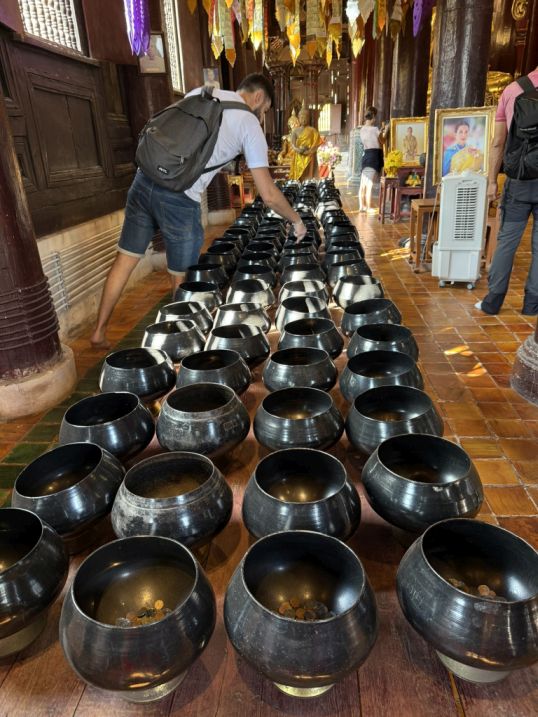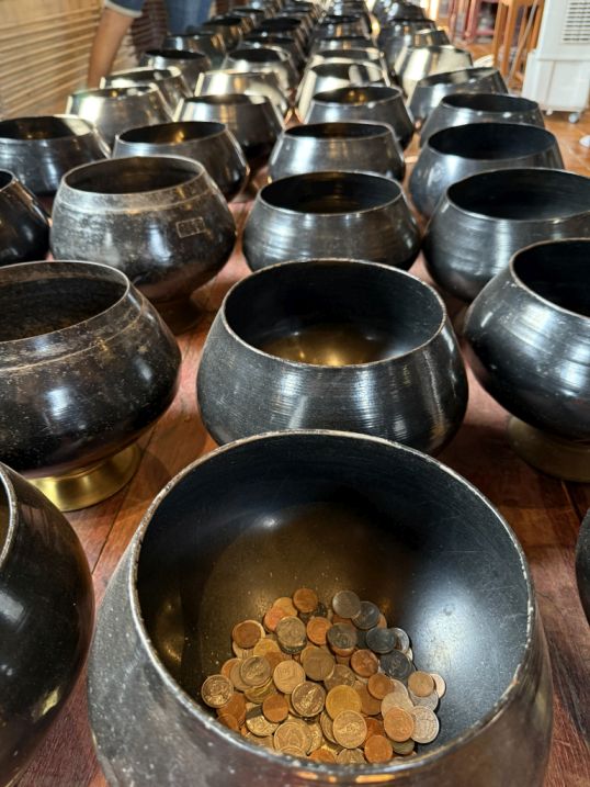 The rows of metal bowls are part of a traditional Buddhist practice. Visitors place small coins into each bowl one by one while walking along the row. Each bowl represents an act of merit-making. By placing coins into many bowls, people symbolically practice generosity and mindfulness, while also supporting the temple. The sound of the coins dropping into the bowls is also said to remind people of the teachings of the Buddha.