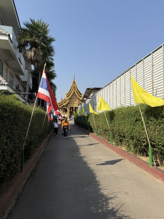The approach to the temple is quite memorable: a narrow, long pathway lined with rows of yellow flags, which symbolize Buddhism and are often used during religious ceremonies.