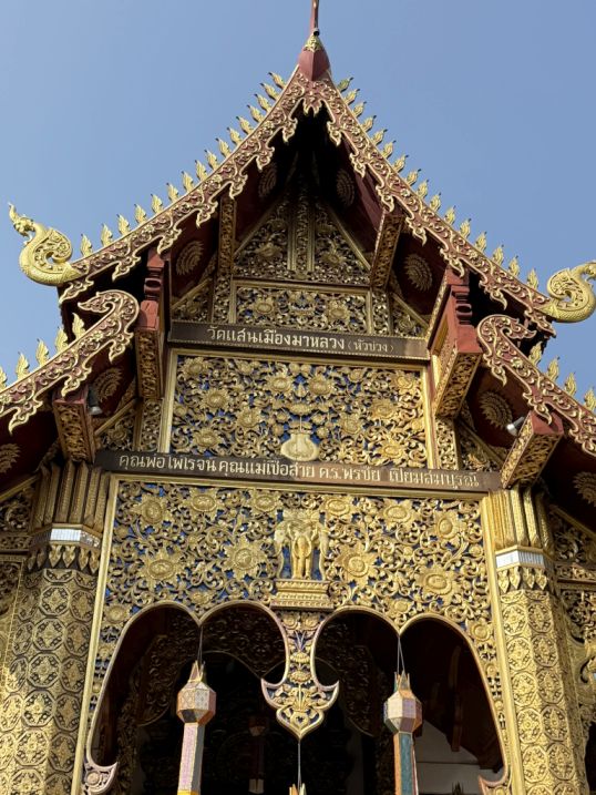 The steep, sweeping Lanna roofline immediately catches the eye, while the carved wooden façade displays floral motifs and mythical creatures traditional to northern Thai design.