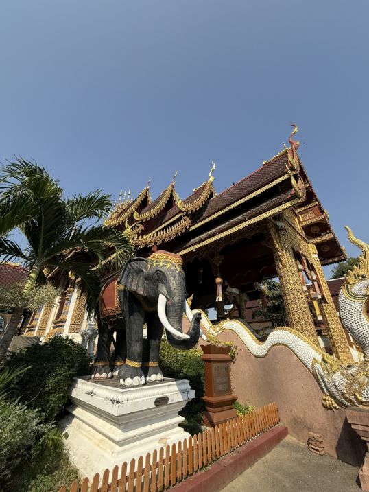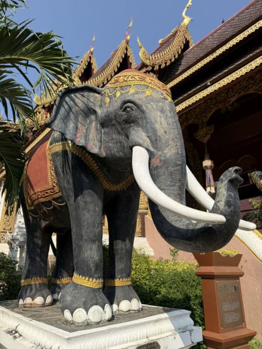 A large elephant statue standing at the entrance. Elephants again symbolize strength and protection and are closely associated with northern Thai royal and religious traditions