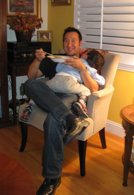 Jason finally trying to eat his soup while holding Sam. Jason put Sam in our bedroom and he slept through until Nancy and Jason were ready to leave around 10ish |