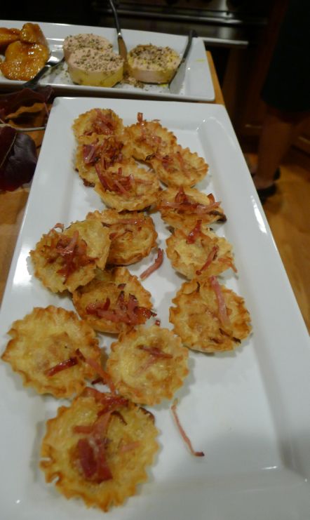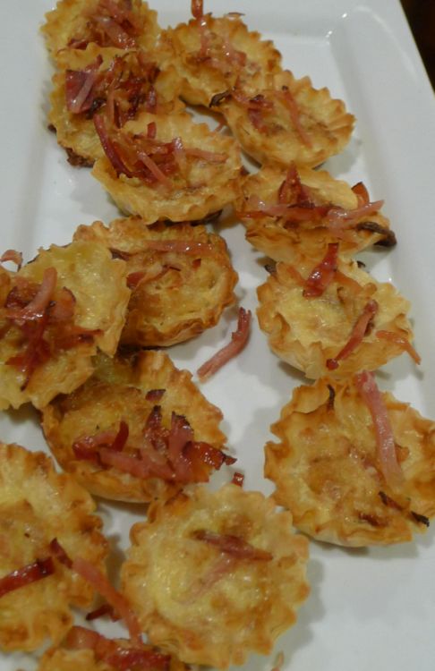 Homemade miniature quiche Lorraine with prosciutto bits.
