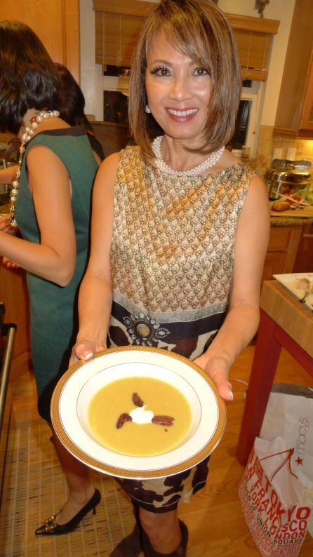 While the turkey is resting, we are serving soup. This year the soup is a departure from the traditional roasted butternut soup instead Maily choose to make a Pear soup with curried pecans.
