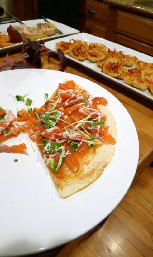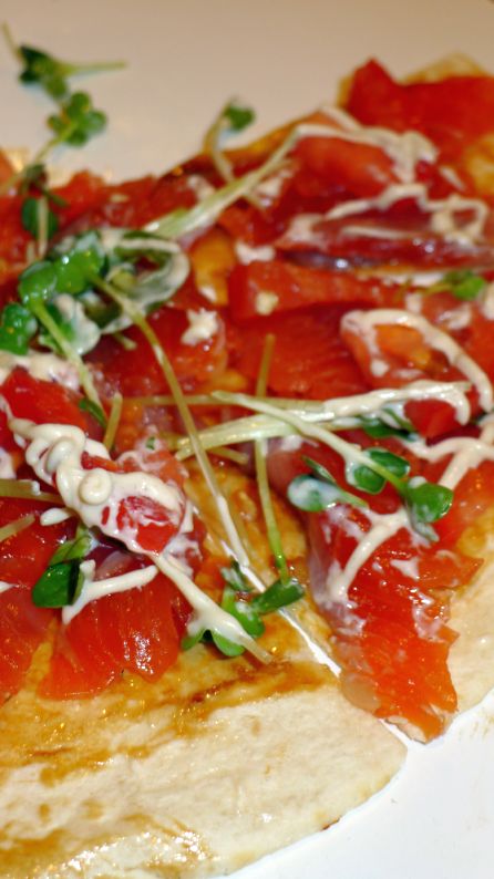 Close look at the Salmon gravalax pizza with anchovy aioli sauce. |