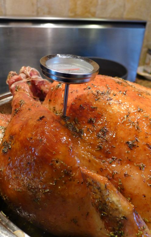 Once it is at the correct temperature the turkey is loosely covered and let to sit for at least 30 minutes or longer. This will allow the cooking juices to be reabsorbed by the turkey, which will ensure moist and tender meat.