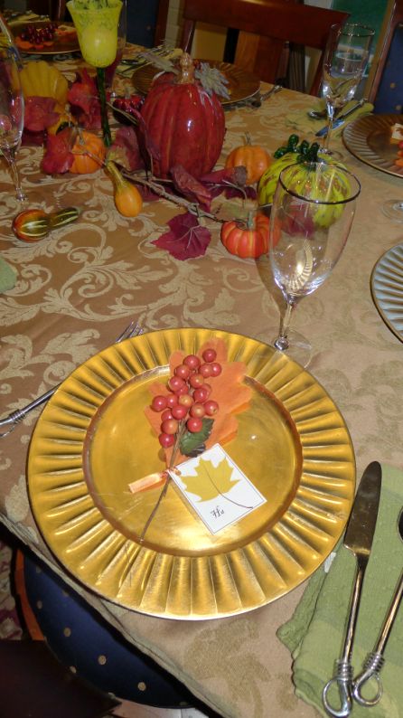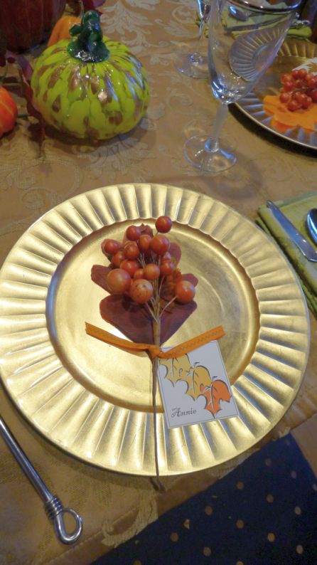 Name tags are printed out and tied around decorative fall leaves and berry clusters stick.