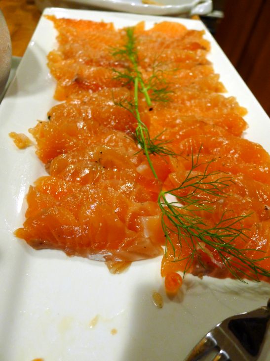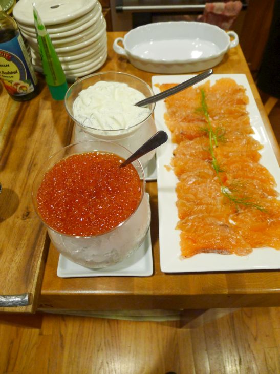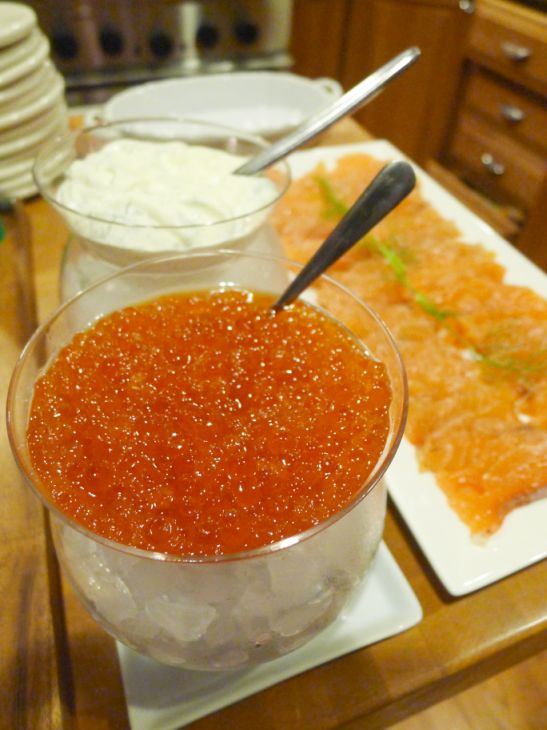 Home cured Salmon Gravalax with red caviar, whole wheat blini and dill crème fraîche.