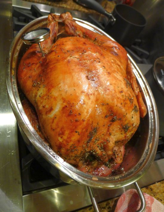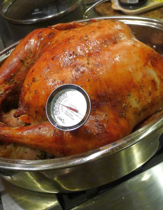 After 4 hours 1/2 in the oven the internal temperature of the turkey has reached the desired 160 degrees. Turkey is now cooked to perfection and it is time to take it out of the oven and let it rest for a least 30 minutes.
