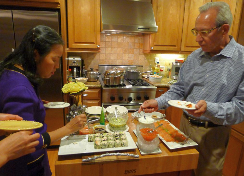 Instead of having the guests add the pickle ginger and the wasabi/soy sauce to each roll, Auntie Kim came up with a great idea by putting the pickled ginger on top of the California rolls so all you need to do is pick up the roll and eat.