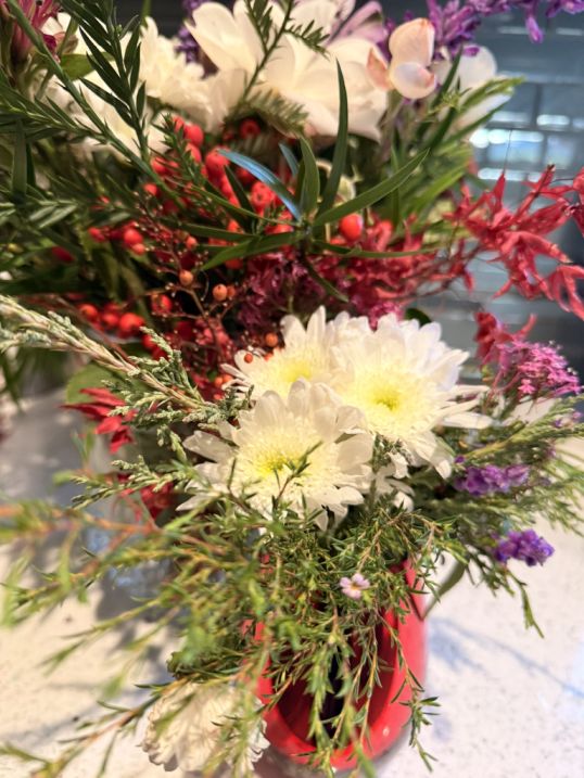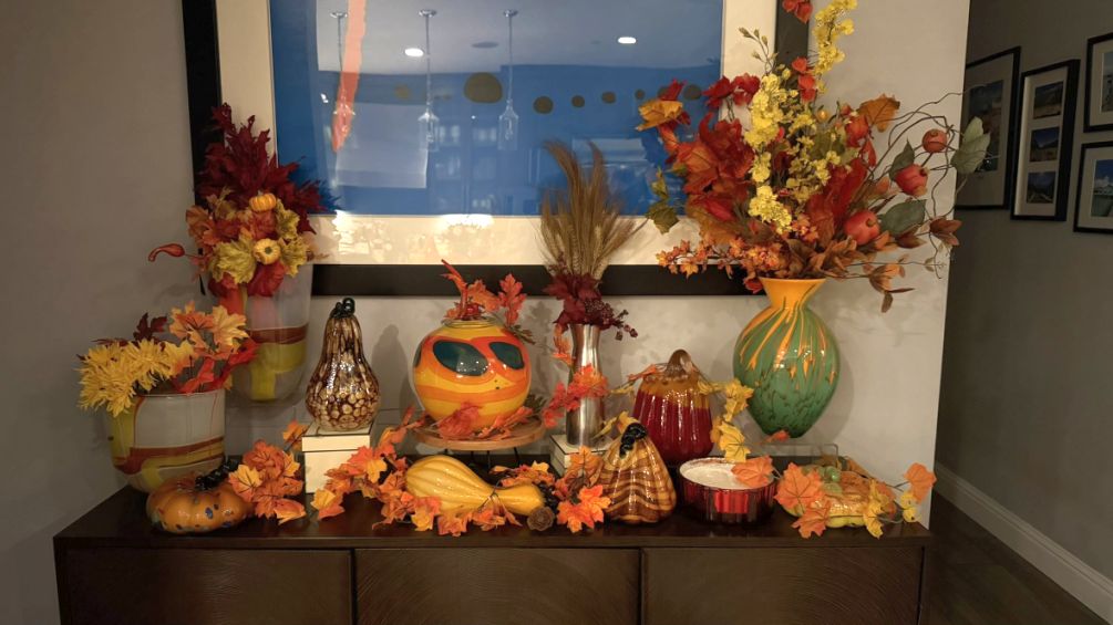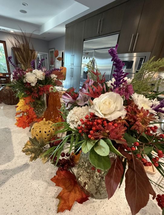The festive theme extends beautifully to the kitchen island, which is crowned with equally colorful decor. This space features two large, very colorful flower arrangements, adding a spectacular burst of fresh life. These arrangements are complemented by a captivating collection of colorful glass and ceramic pumpkins, alongside even more foliage, creating a layered, lush, and welcoming atmosphere..