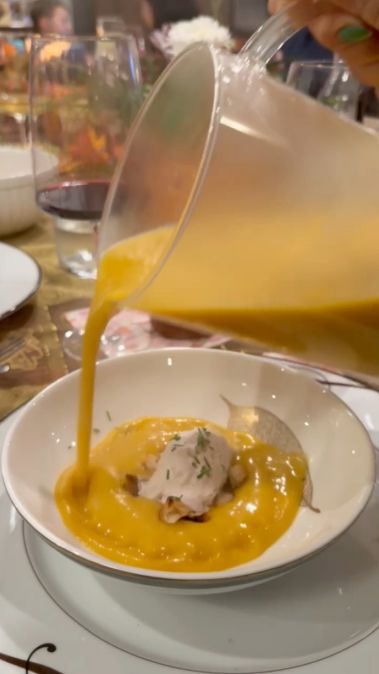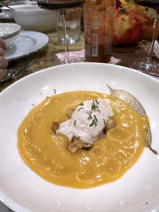 The shrimps are really good and then afterward we are serving a winter squash soup with cocoa whipped cream.