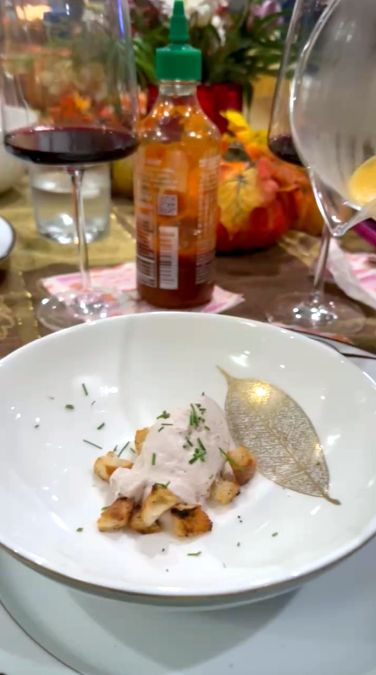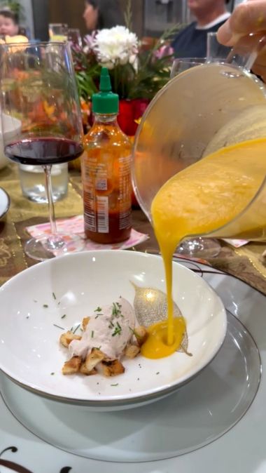 The soup is brought out to the table with croutons, cocoa whipped cream, and chives and then the winter squash soup is poured over.