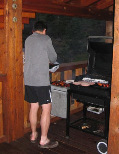 Tuan is putting on the grill a bunch on hamburgers, assorted sausages and flank steak. |