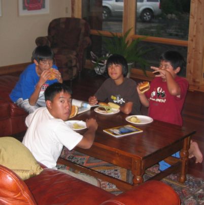 The kids enjoying their juicy hamburger!