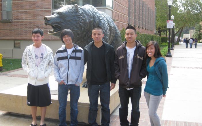 Nicky, Kevin, Vu, Justin and Christina. posing in front of the statue of the UCLA Bruin (UCLA's Mascot).