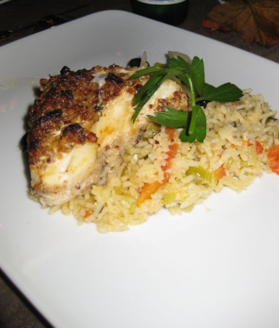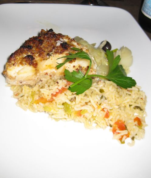 Roasted sea bass with crusted nuts on a bed of rice pilaf!