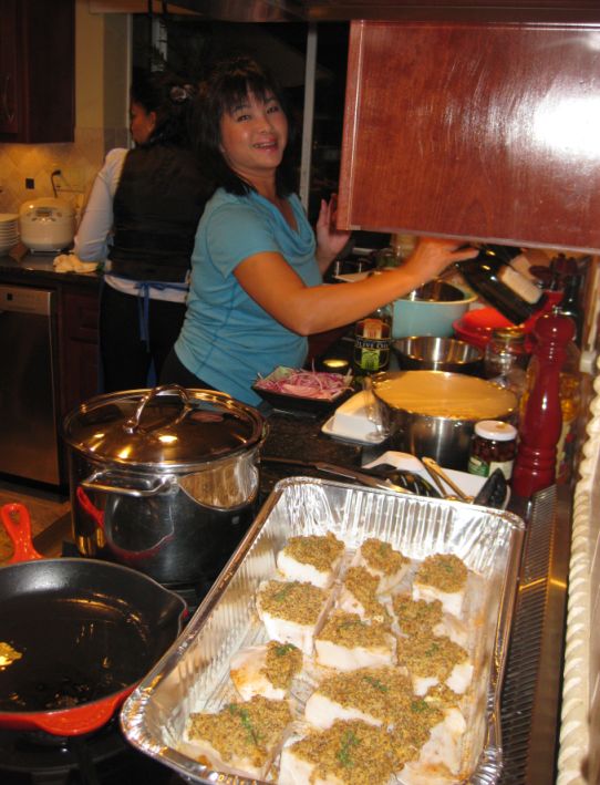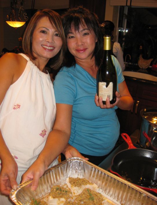 Loan and Maily ready to pour some white wine into the large tray of sea bass. |