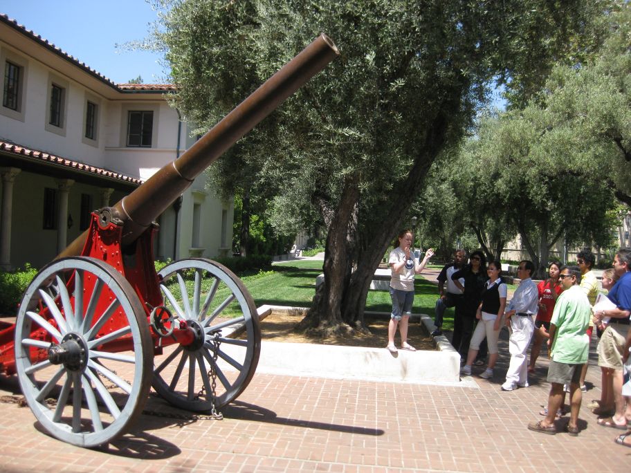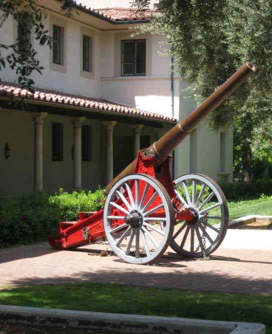 The Fleming Cannon, a Caltech landmark rests on its wheels on the Olive Walk in front of Fleming House. As it makes a very loud noise when fired, it is fired to mark important events, such as the end of rotation, Ditch Day, the end of the term, and graduation. It was originally cast for use in the Franco-Prussian War. |
