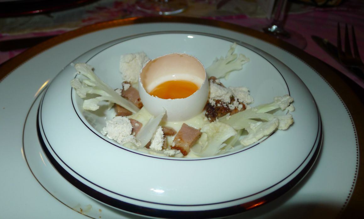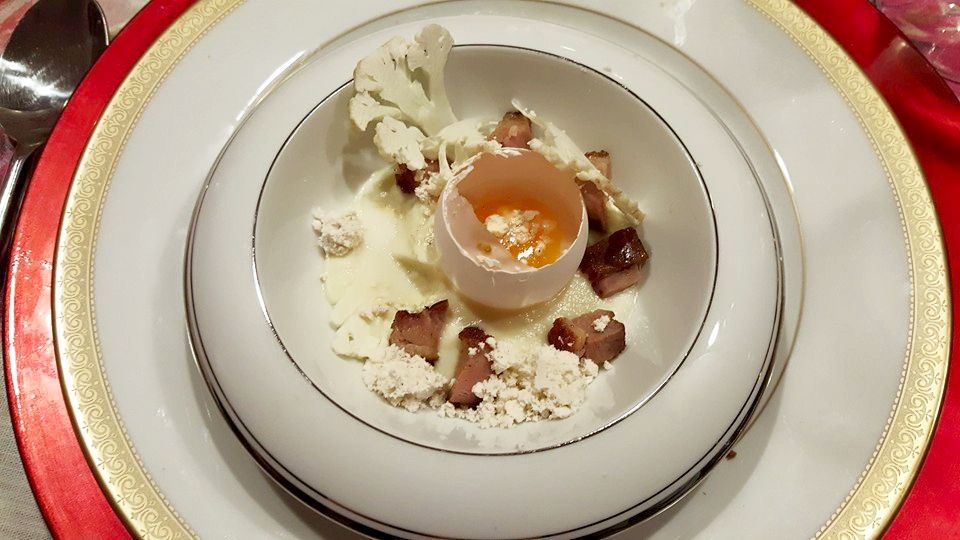 1-Cauliflower puree, egg, burned butter, and crispy smoked duck breast.