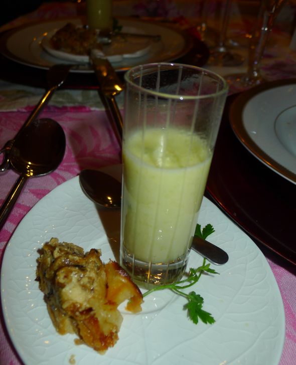 The last appetizer is a shot of Asparagus vichyssoise served with a tiny piece of caramelized quiche.