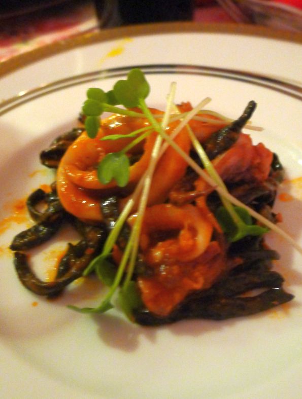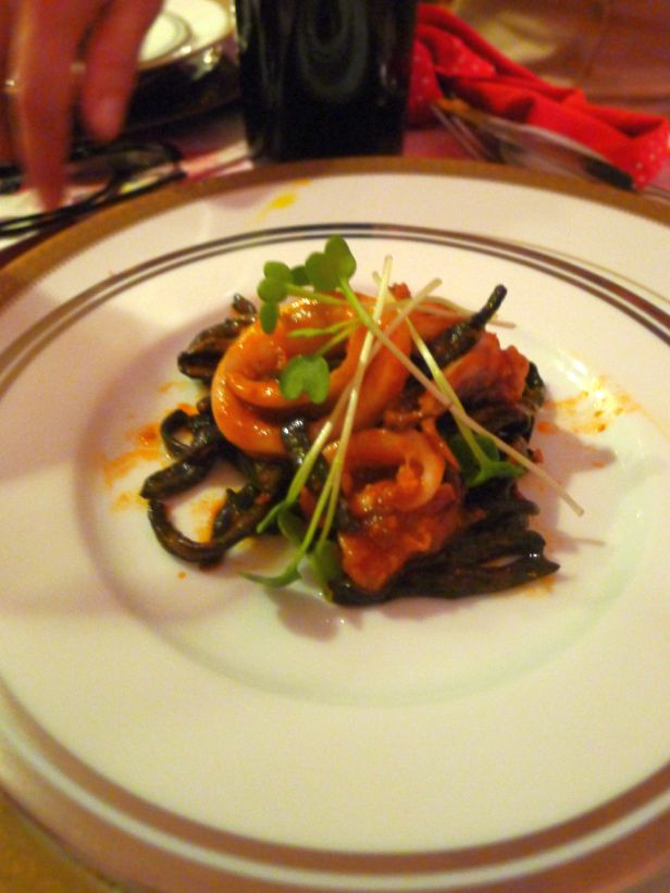 The next dish is a homemade squid ink tonnarelli with calamari, tomatoes and white wine. Here I just finished cooking it am trying to serve it.