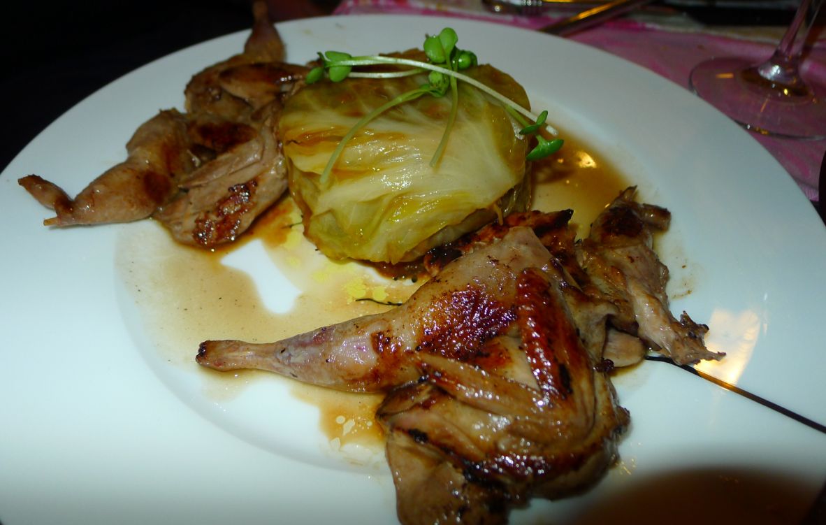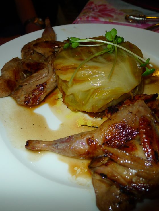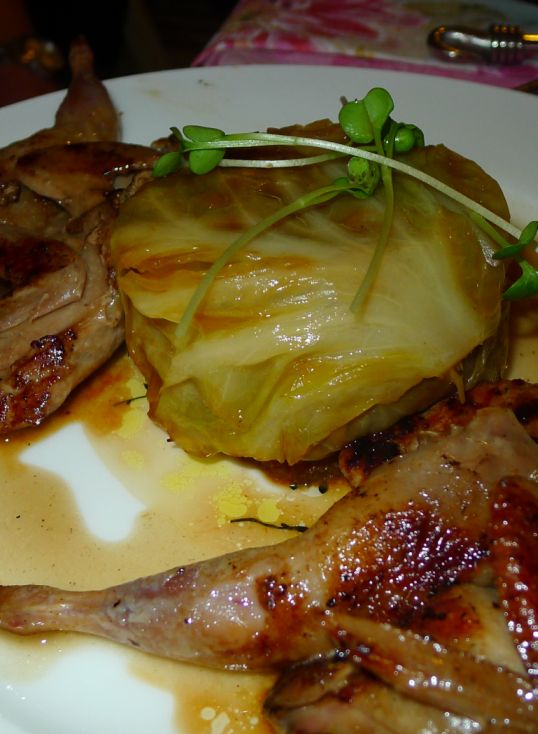 Chartreuse of quail, sauteed cabbage, bacon, carrots, canned foie gras wrapped in cabbage leaves
